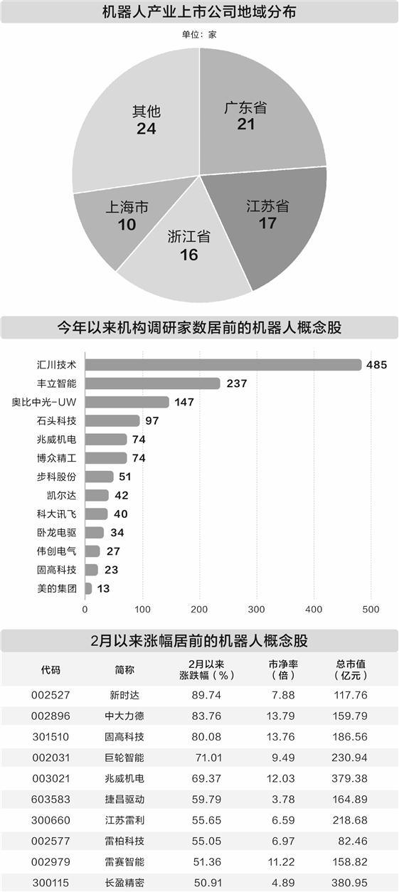 年初以来,机器人概念股获得机构高度关注,13只个股获10家以上机构调研。汇川技术、丰立智能、奥比中光-UW机构调研家数居前,分别为485家、237家、147家。