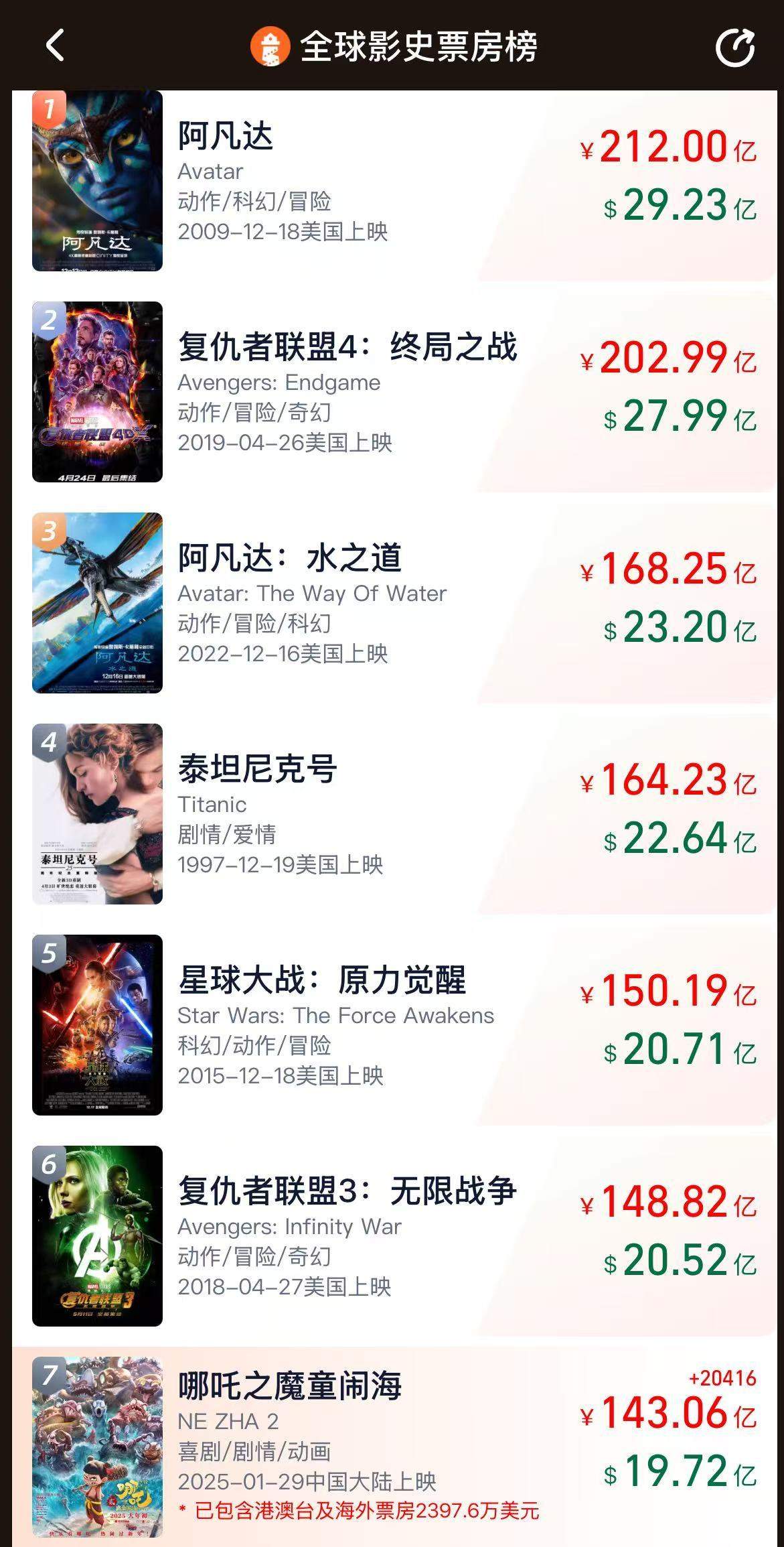 【《哪吒之魔童闹海》全球电影票房破 135 亿,暂列全球票房榜第 8 位】在国家电影局指导下,经中央政府驻港联络办、中央政府驻澳联络办和香港特区政府相...