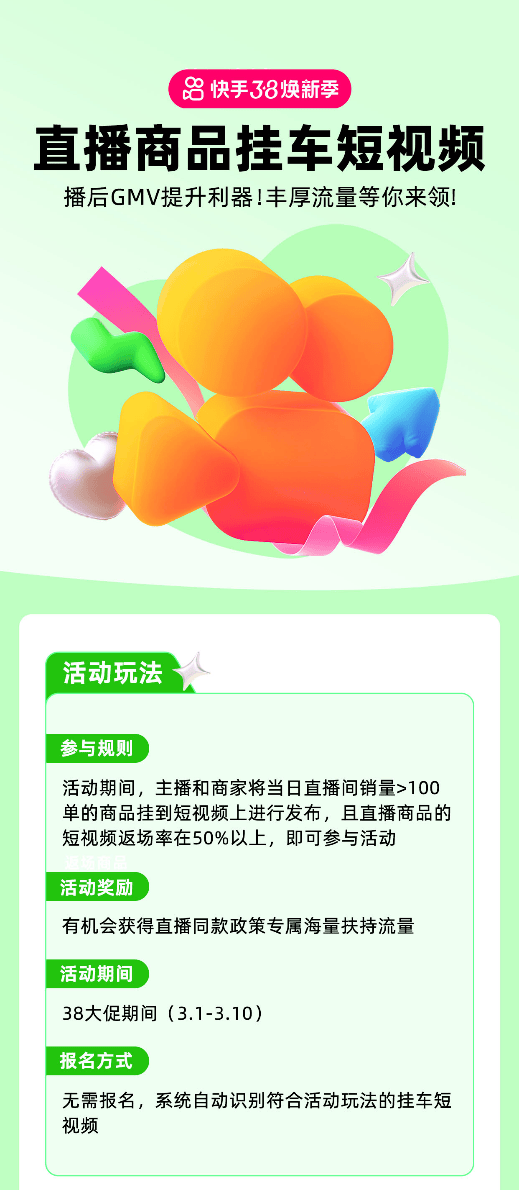 在3月1日至10日的大促活动期间,主播和商家将当日直播间销量超过100单的商品挂到短视频上进行发布,并确保直播商品的短视频返场率高于50%,即可参与活动。主播和商家无需额外报名,平台将自动识别符合活动玩法的挂车短视频,并根据商品直播销量、短视频发布时效及质量,为符合条件的商品提供流量曝光支持。