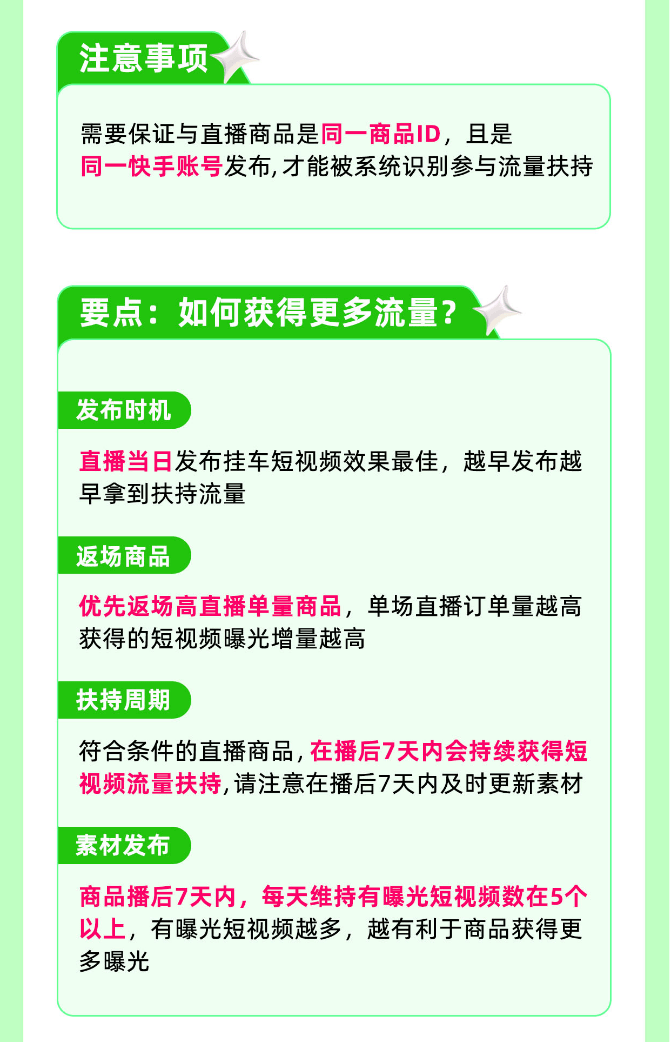 具体来看,商家越早发布挂车短视频,就能越早获得扶持流量,直播当天发布同款挂车短视频将获得最佳激励效果;商品选择上,商家可优先发布返场高直播单量商品,单场直播订单量越高,获得的短视频曝光增量就越高;符合条件的直播商品将在播后7天黄金期内持续获得短视频流量扶持,商家可持续更新素材,每日维持至少5条有效曝光短视频,从而实现激励收益最大化。