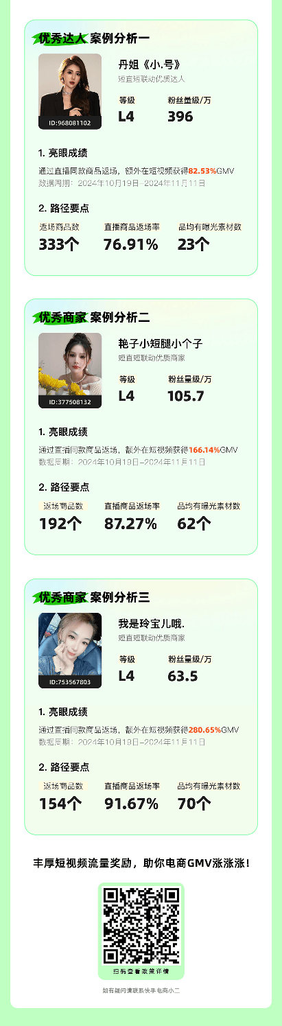 借助挂车短视频打通流量场域,不少主播和商家此前便实现爆款产品的长期打爆,撬动更高GMV增长。达人“丹姐”打造333个返场商品,直播商品返场率超76.9%,额外在短视频获得82.53%GMV;商家“艳子小短腿小个子”打造192个返场商品,直播商品返场率达87.27%,品均有曝光素材数达62个,额外收获166.14%GMV;商家“我是玲宝儿哦.”打造154个返场商品,并实现了91.67%直播商品返场率,额外在短视频获得280.65%GMV。