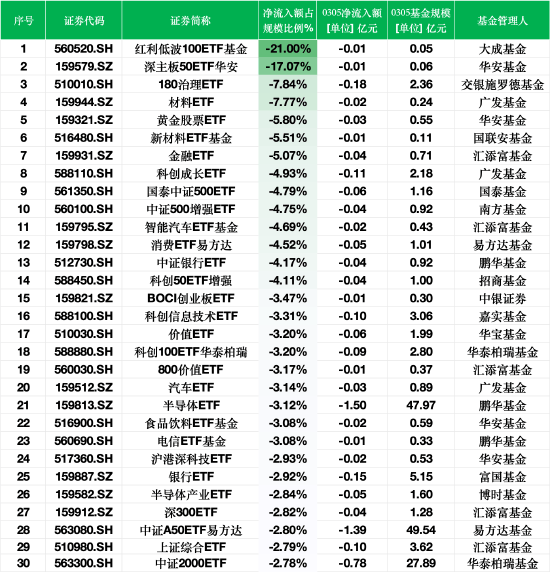 3月5日ETF资金流出榜单:红利低波100ETF基金净流出额占规模比例21%,深主板50ETF华安占比17.07%