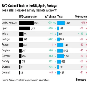 比亚迪在海外市场的表现更是可圈可点。2 月海外市场销量再创新高,达到 67025 台,连续两个月突破六万台,若算上皮卡的出口量,更是突破 7 万大关。这一成绩远超新势力蔚小理三家车企的总和,甚至能媲美其他大厂总销量。在英国、西班牙和葡萄牙等市场,1 月份比亚迪销量成功反超特斯拉,比亚迪在巴西、墨西哥等国荣膺纯电和插混销冠。海外销量、口碑、品牌影响力全面提升,进一步巩固了其全球新能源领导者的地位。