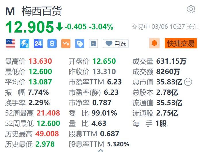美股异动|梅西百货跌超3% 2025财年营收指引不及预期 指消费者依然谨慎