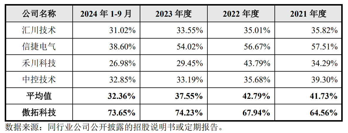 值得注意的是,报告期内同业可比公司的毛利率平均值分别为41.73%、42.79%、37.55%、32.36%。显然,可比公司的毛利率远低于傲拓科技,且逐年下降,与傲拓科技变动趋势相反。