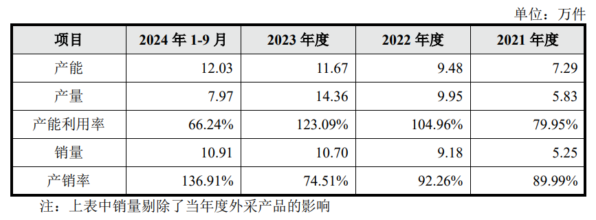 另外需要注意的是,2022年及2023年公司产能利用率分别为104.96%和123.09%,而2024年前三季度公司产能利用率急转直下,达到66.24%的水平。