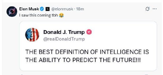 美国总统特朗普在社交媒体发文称:“对智力的最佳定义是预测未来的能力!!!”马斯克则转发截图,并回应表示:“说实话,我早就料到会这样。”