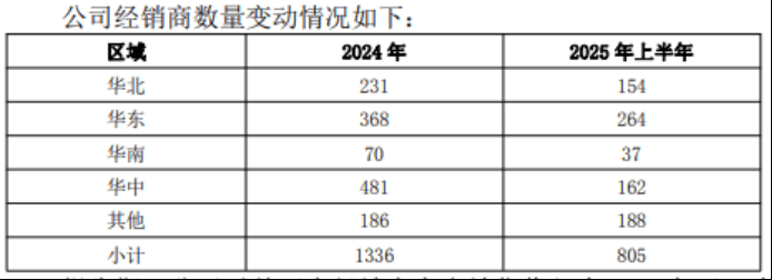 今年上半年,酒鬼酒线上渠道销售0.9亿元,线下渠道销售4.68亿元,线下销售占总销售额比重超八成。截至6月末,酒鬼酒的经销商数量持续收缩至805家。其中,华中地区经销商数量的减少尤为明显,由2024年末的481家减少到2025年上半年末的162家,减少了319家。与此同时,华北、华东、华南三个区域的经销商较去年末分别减少了77家、104家、33家。