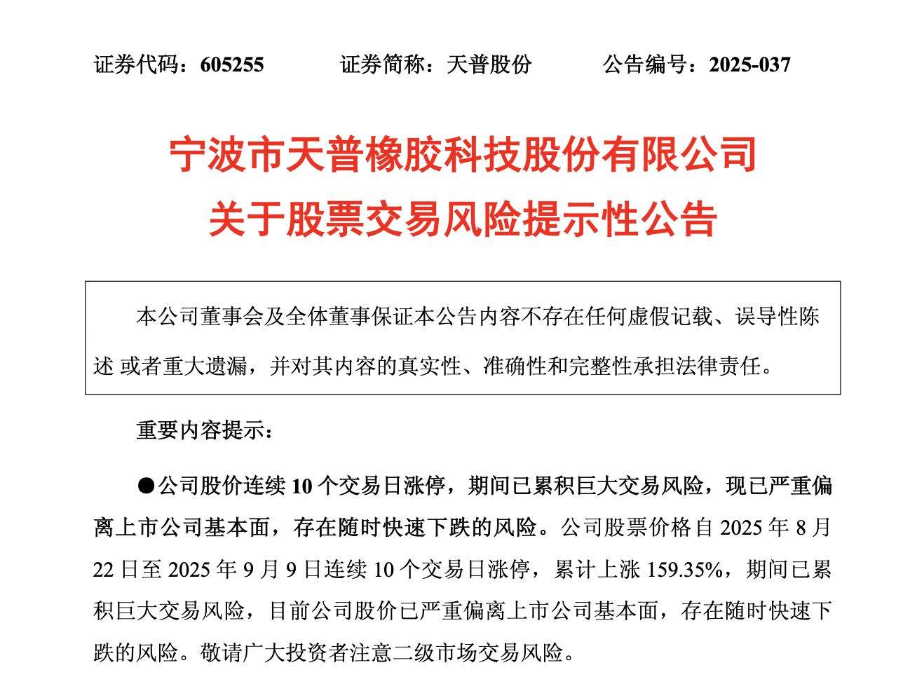 9月9日晚间,天普股份(605255.SH)发布股票交易风险提示性公告,公司股票价格自2025年8月22日至2025年9月9日连续10个交易日涨停,累计上涨159.35%,期间已累积巨大交易风险,目前公司股价已严重偏离上市公司基本面,存在随时快速下跌的风险。公司主要产品为汽车用高分子流体管路系统及密封系统零件及总成,主要应用于传统油车整车制造,目前公司主营业务未发生重大变化。