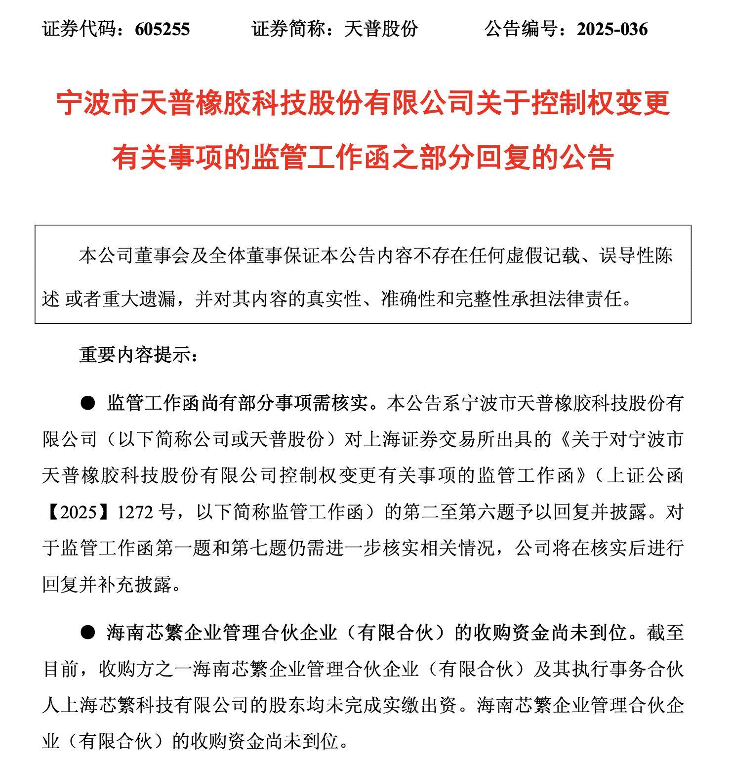 同日稍早前,天普股份发布股票交易风险提示性公告称,监管工作函尚有部分事项需核实。公司已对上交所出具的《关于对宁波市天普橡胶科技股份有限公司控制权变更有关事项的监管工作函》进行部分回复,尚有部分事项需进一步核实相关情况,公司将在核实后进行回复并补充披露。