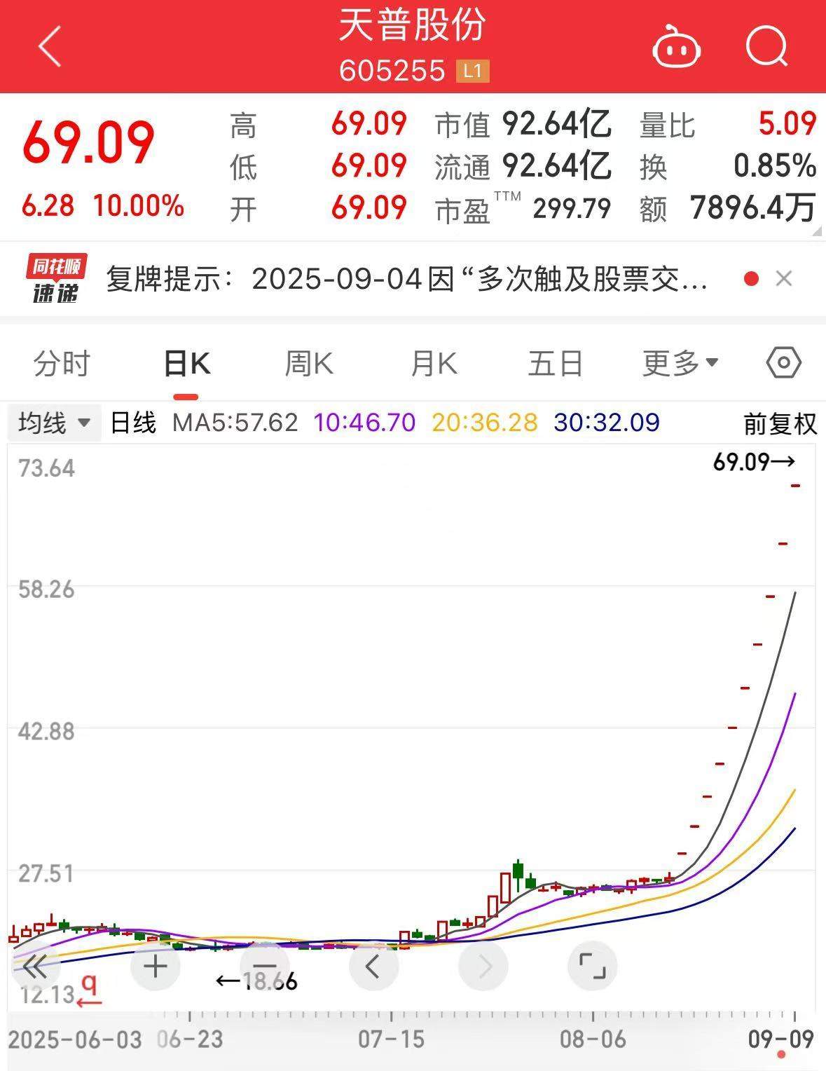 盘面上,截至今日收盘,天普股份再度涨停,收获10连板,最新报69.09元/股,市值92.64亿元。