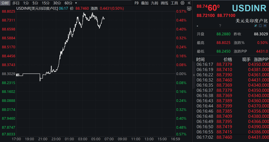 9月23日盘中,印度汇率再度跳水,卢比兑美元跌跌幅一度接近0.6%并跌破88.80,再创历史新低。自上周四以来,卢比兑美元累计跌幅接近1%。有交易员称,印度央行可能会通过国有银行出售美元以支撑卢比。