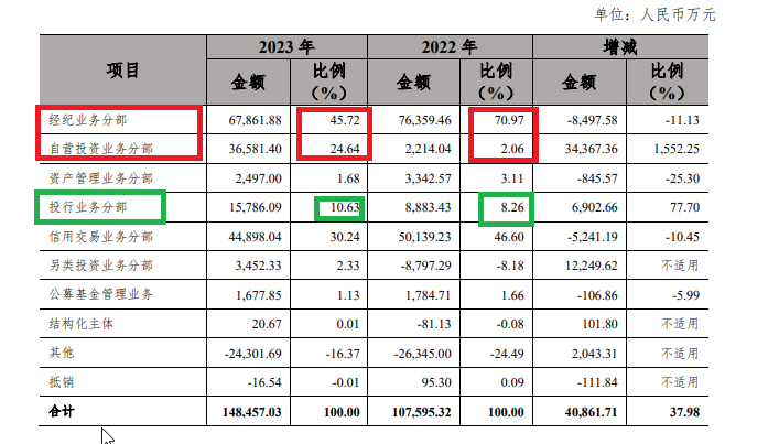 2022年和2023年,湘财证券经纪业务收入占比分别为70.97%、45.72%;自营业务收入占比分别为2.06%、24.64%;两项业务收入占比合计超七成。