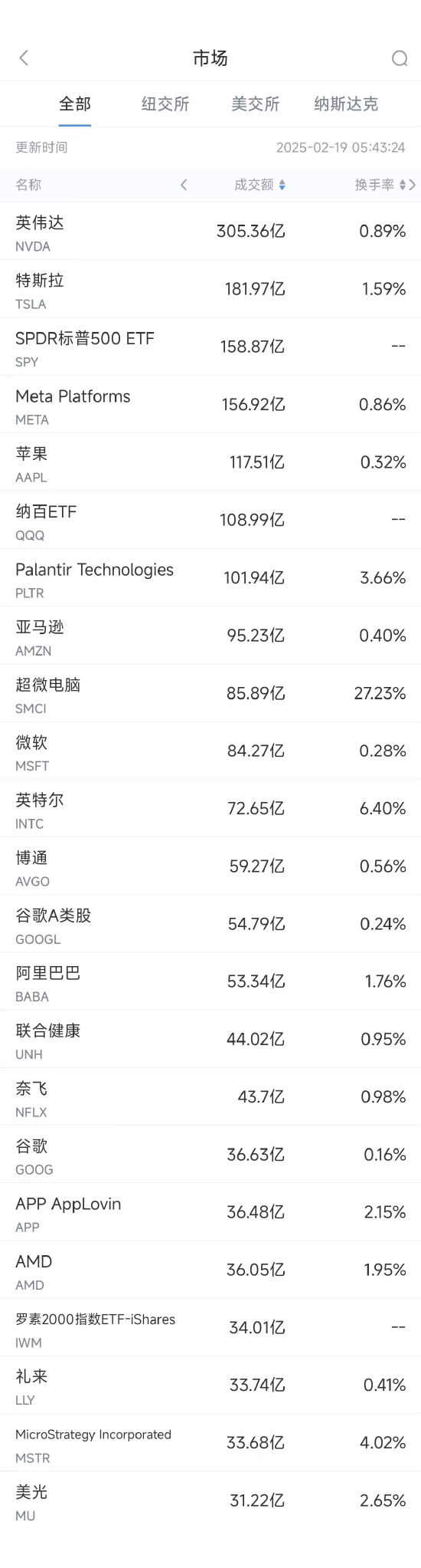 周二美股成交额第1名英伟达收高0.4%,成交305.36亿美元。特斯拉CEO马斯克周二在直播中首次披露了Grok 3的训练成本,称Grok 3训练过程累计消耗20万块英伟达GPU。